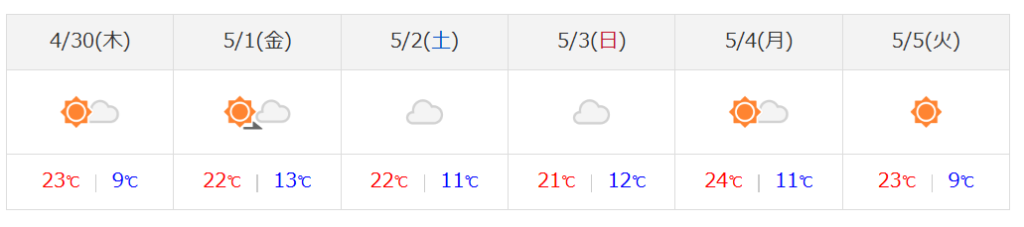 | 日中の気温 | 20〜25℃前後(半袖でも十分な日も) |